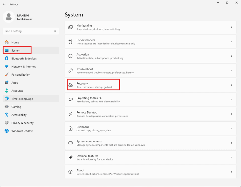 - Now, click the System > Recovery button.